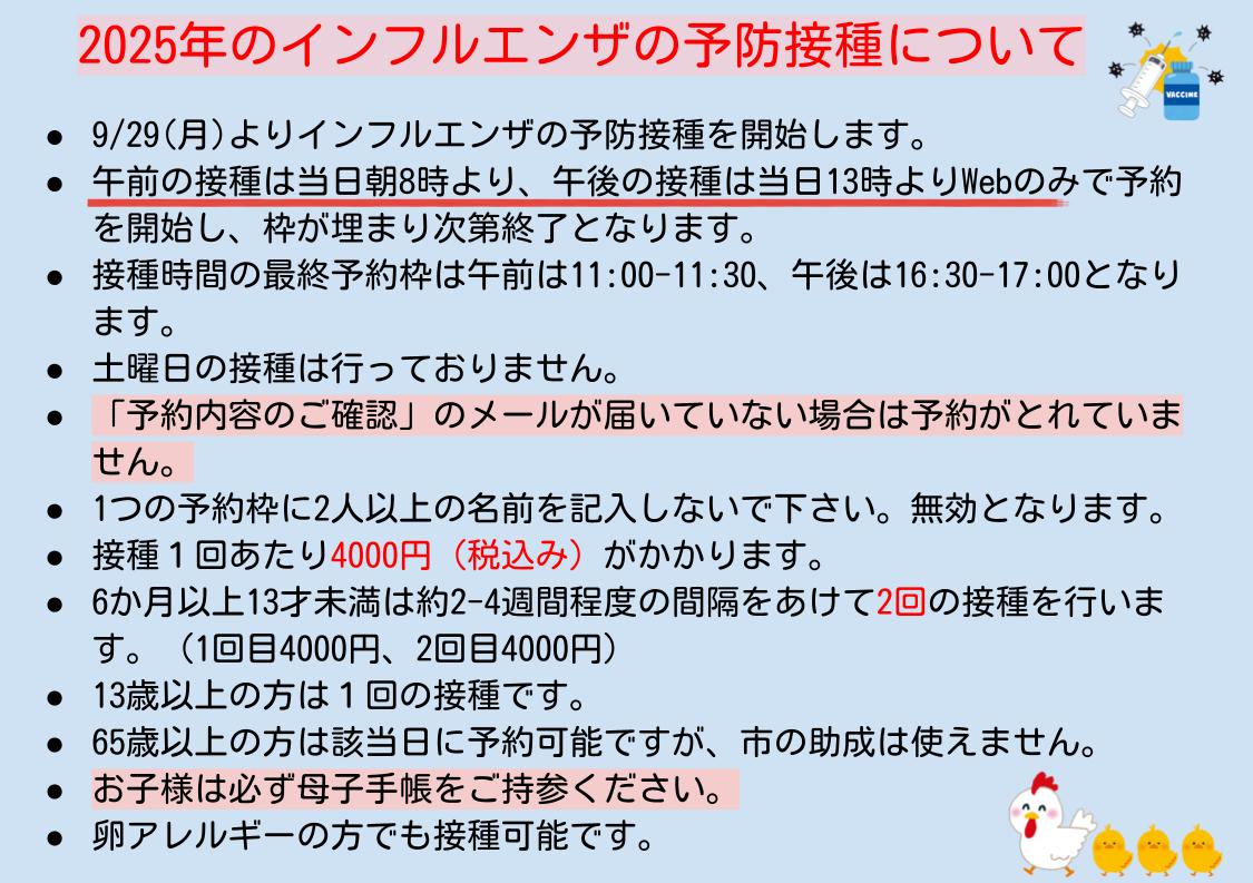- 乳児の予防接種は生後2か月より行っております(ロタ、肺炎球菌、B型肝炎、5種混合)。必要に応じて、乳児期からできるアレルギー疾患予防のコツをお話しします。