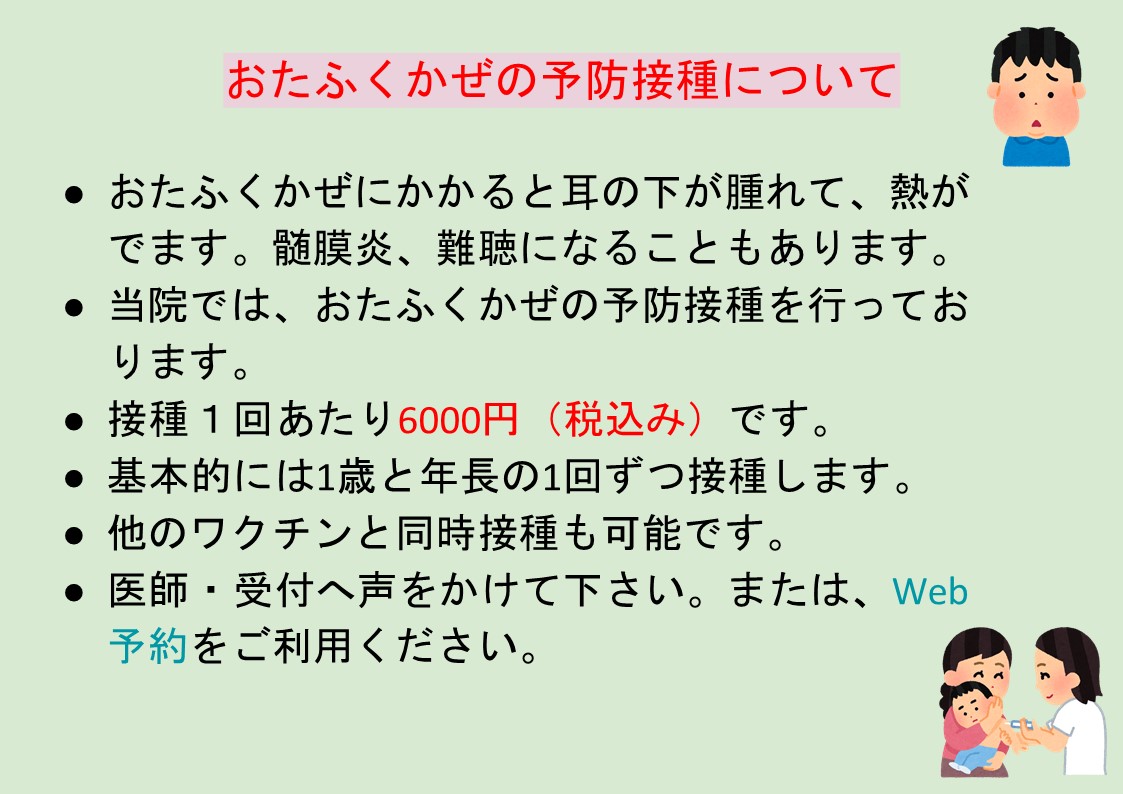 - おたふくかぜワクチンは現在接種可能です。在庫がなくなり次第終了となります。
