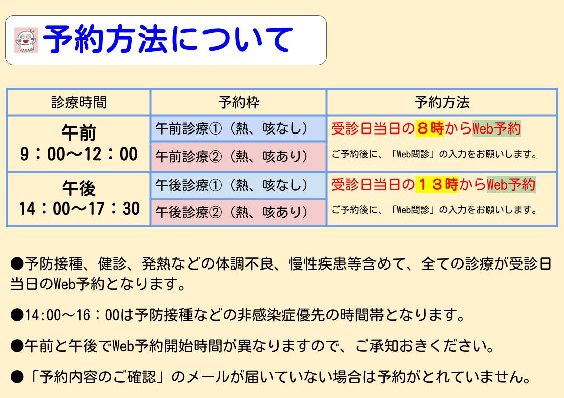 - 当院は予約制です。御予約は「Web予約」を御利用ください。 御予約後に、「体調不良の有無」や「受診時の相談の内容」などについて、「Web問診」の入力をお願いします。混雑時等、お電話に出られない場合があります。「熱がでているため受診した方がいいか」等のお電話での御相談は受け付けておりません。